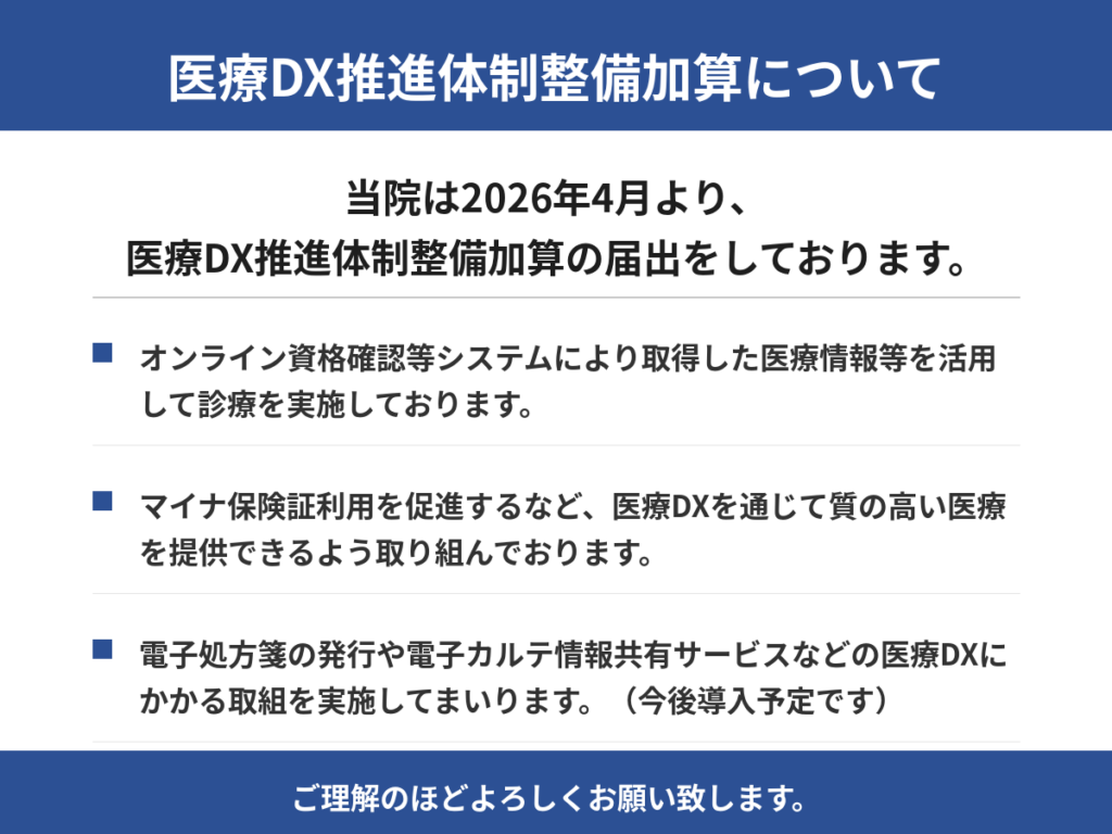 医療DX推進体制整備加算について 2026.03.27 当院は2026年4月より、医療DX推進体制加算の届出をしております。 下記よりご確認ください。 クリニック名称変更のお知らせ 前の記事 時間外対応加算について 次の記事