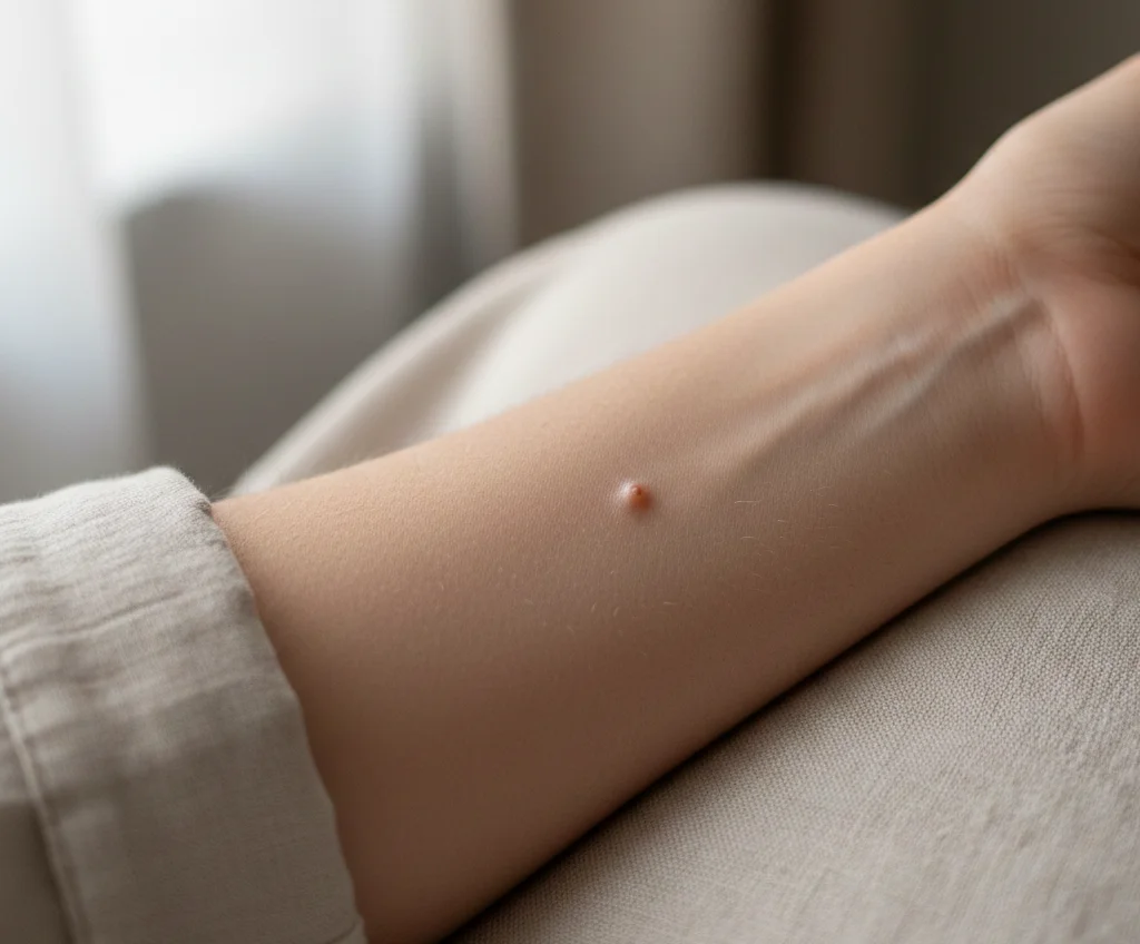 炎症初期の段階では、粉瘤のある皮膚周囲が赤みを帯び始めます。それまで目立たなかったしこりが、急に赤くなってきたと感じたらこのサインを見逃さないようにしましょう。見た目としては、虫刺されや軽いニキビのように見えることもあり、この段階では区別がつきにくい場合もあります。